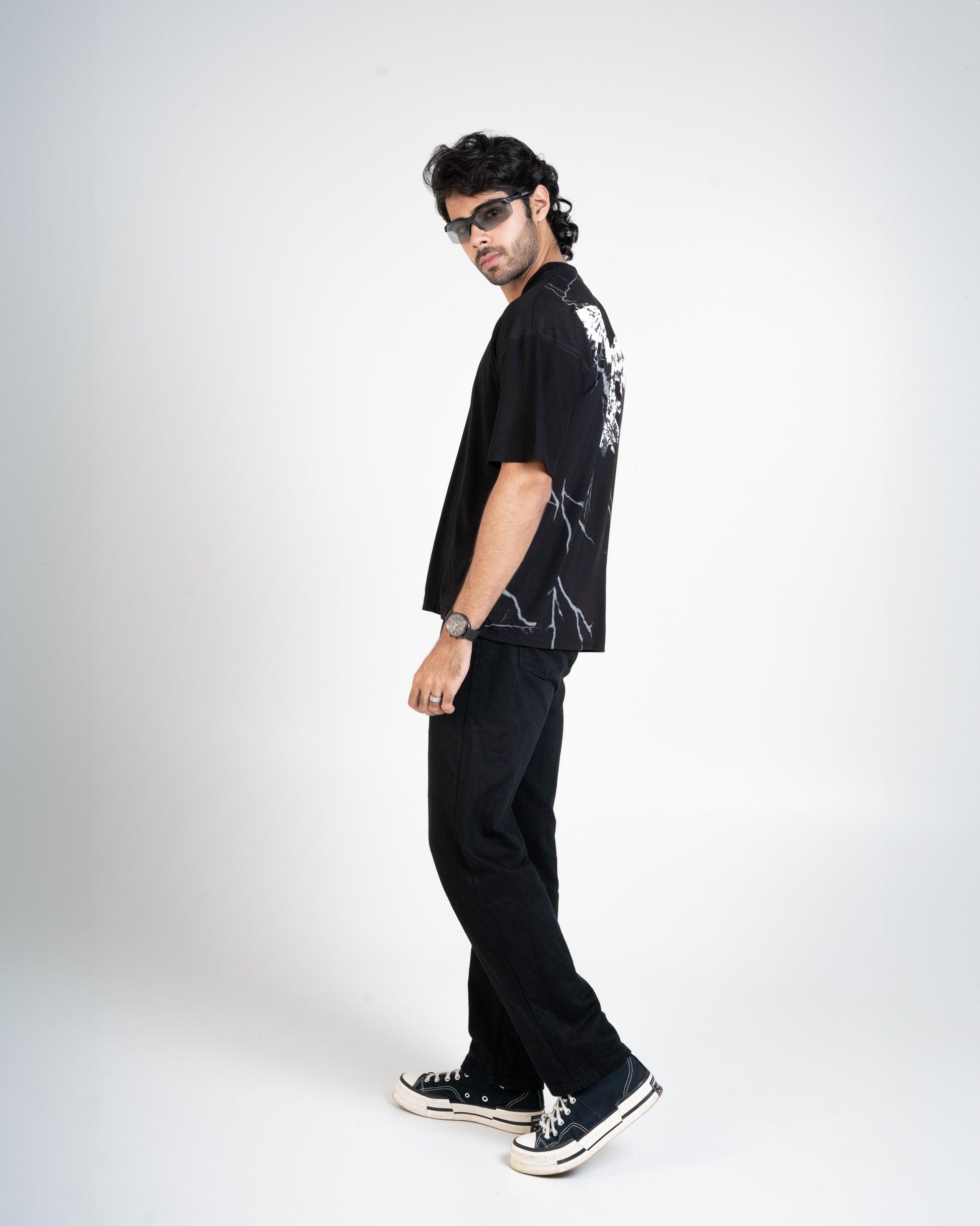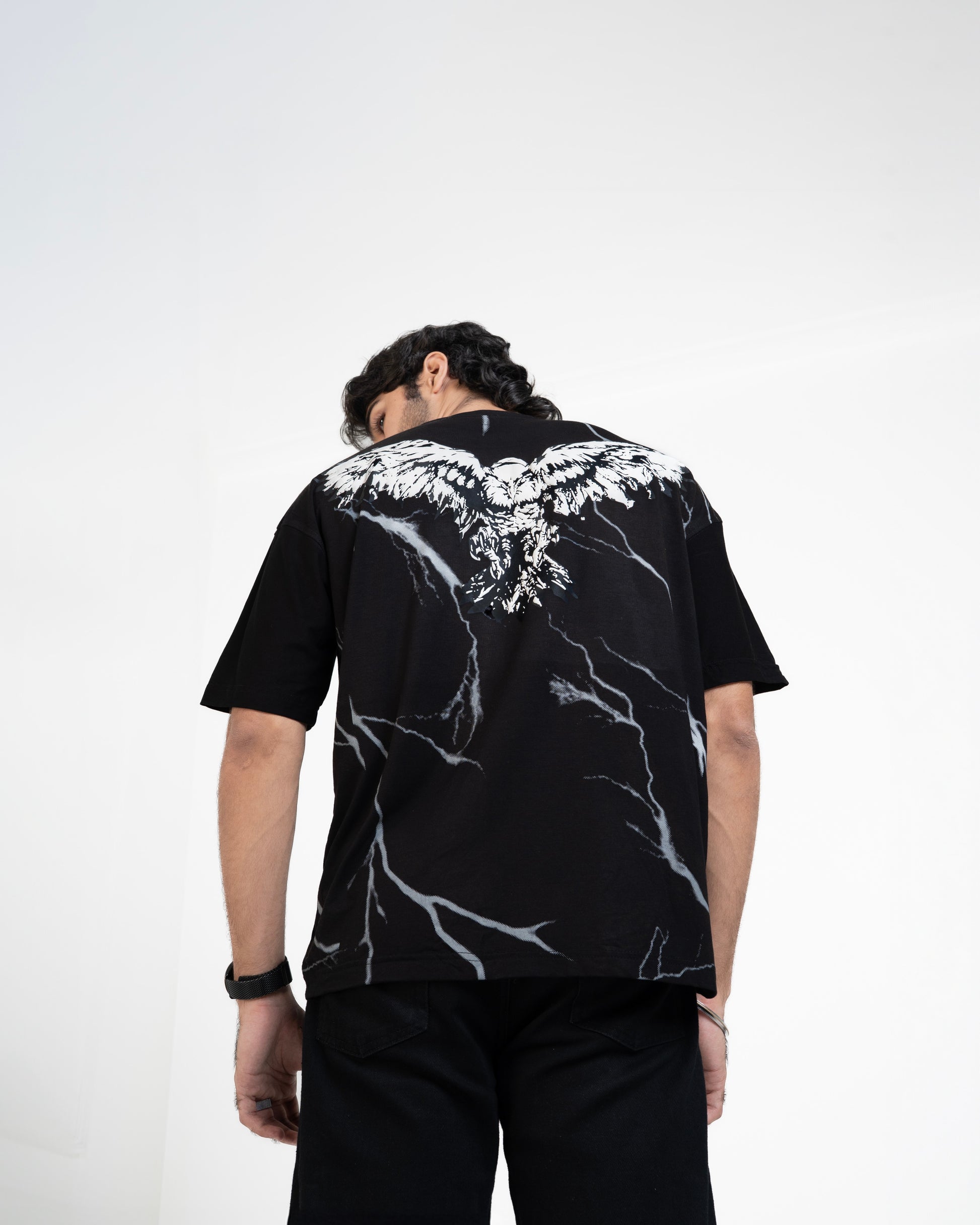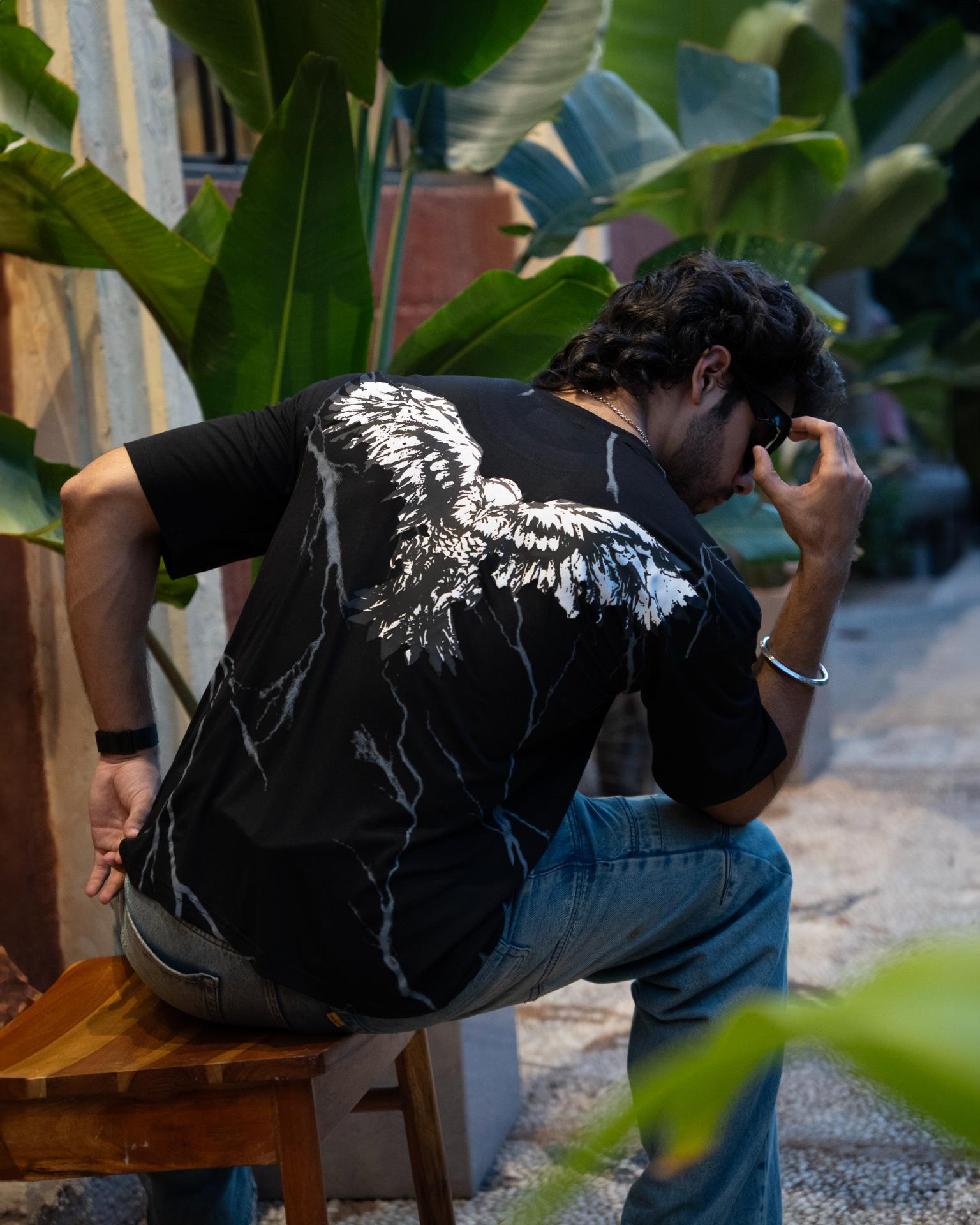 Lightweight but loud — this black bamboo Lycra tee hits different. Draped in smooth stretch fabric that moves like second skin, it brings comfort without compromise. The back flexes with a raised puff-print eagle, wings wide over a glitched-out pixel lightning storm. Power, precision, and pixel chaos.