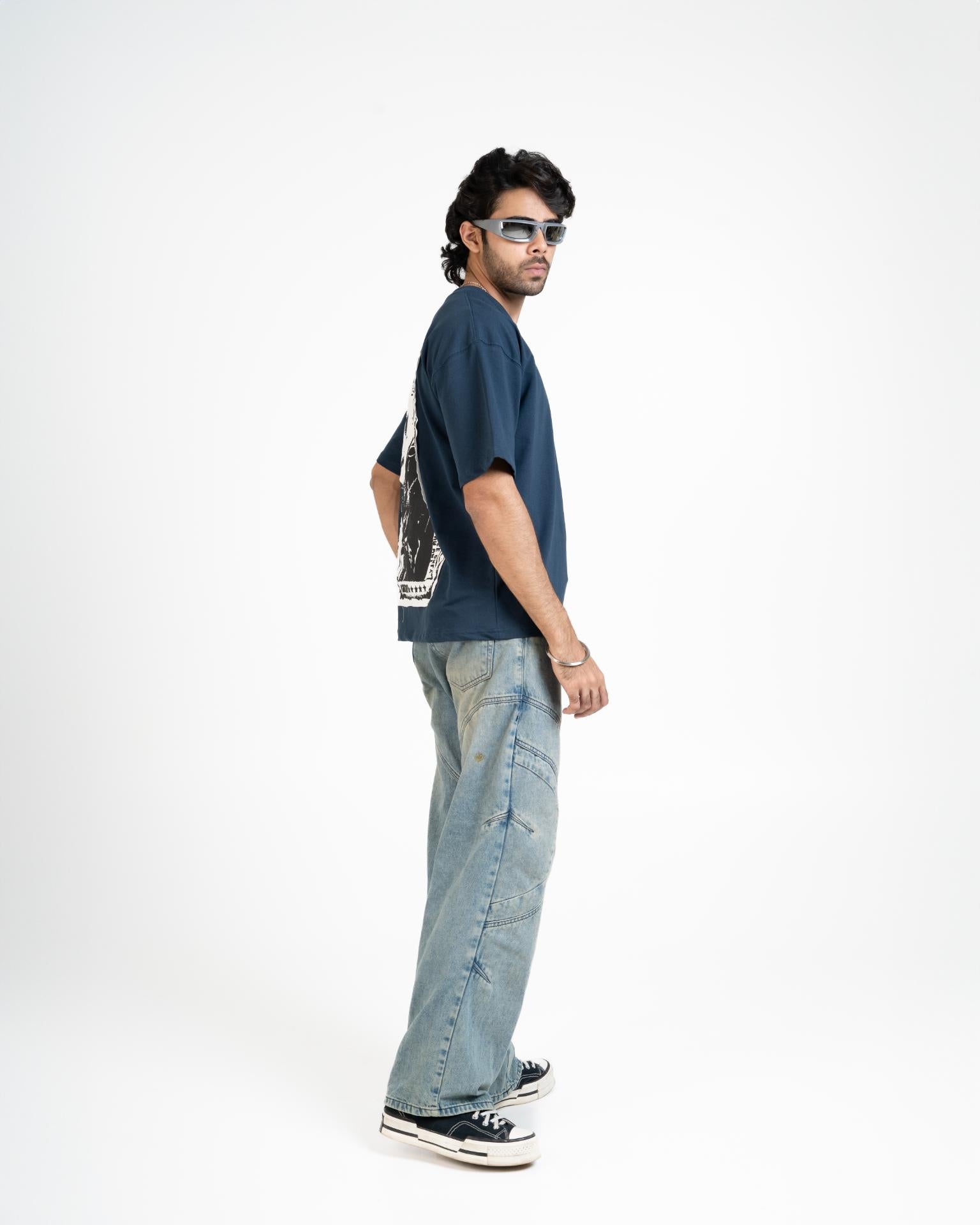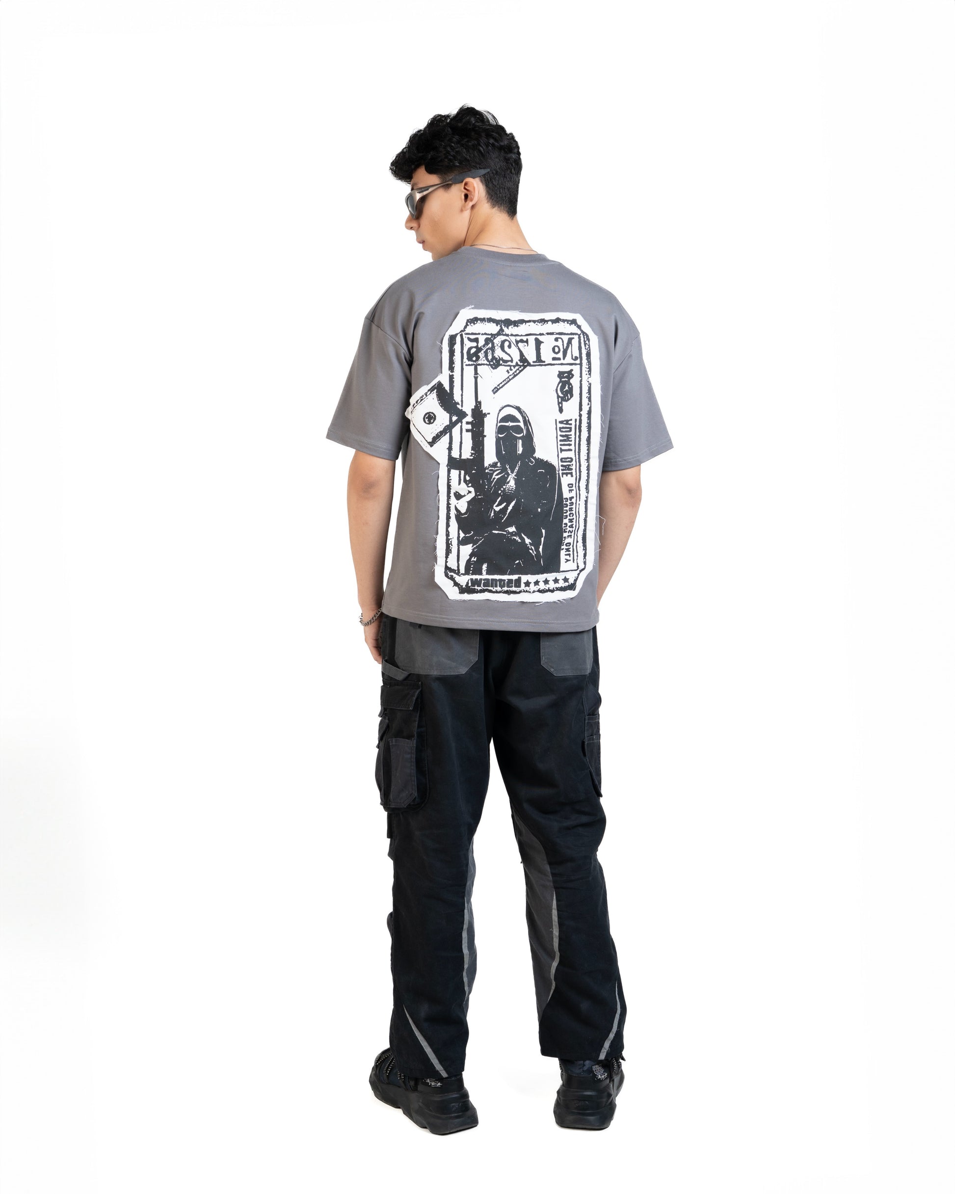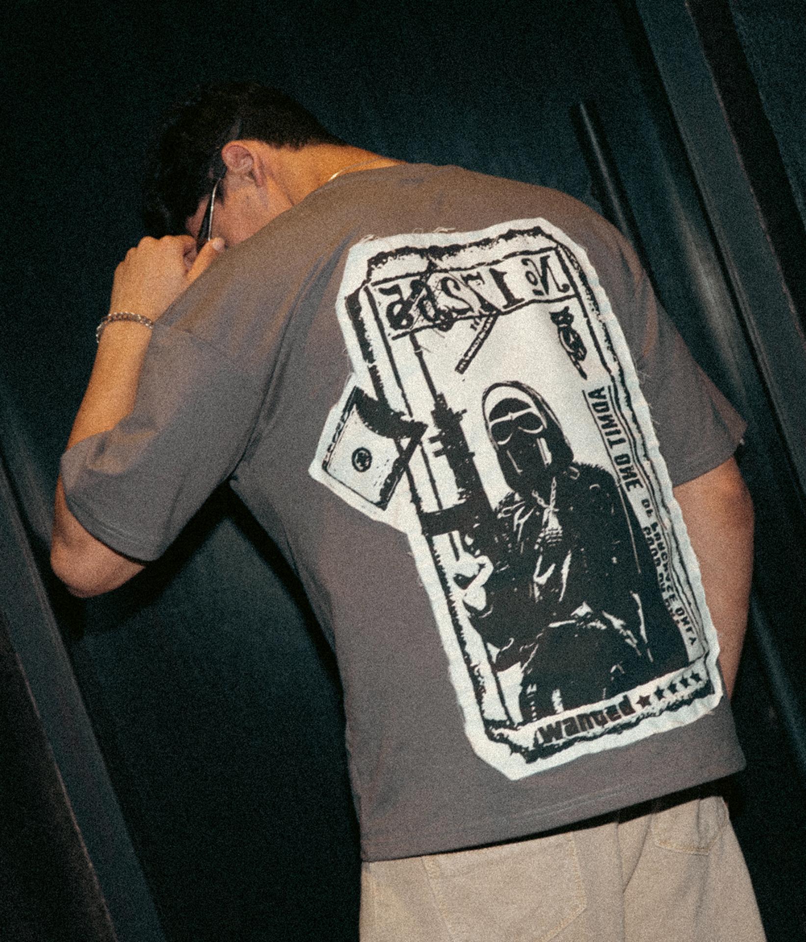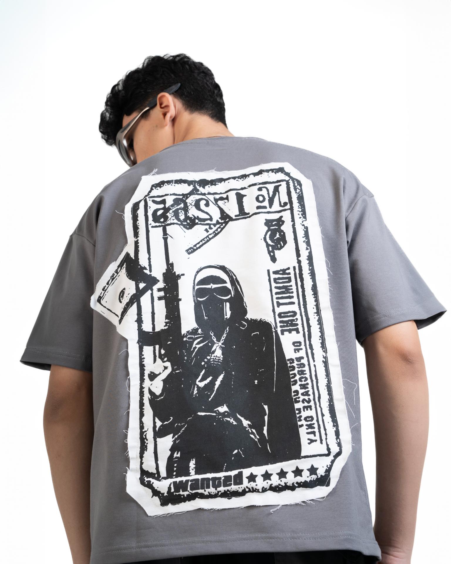 A bold fusion of street style and raw creativity. This blue and grey tee stands out with an oversized patchwork design, featuring loose thread details for a rugged, deconstructed look. The statement graphic brings to life a hand-sketched gangster illustration on a vintage ticket, blending nostalgia with an unapologetic edge. Designed for those who make their own rules, this piece is a nod to urban rebellion and artistic expression.
