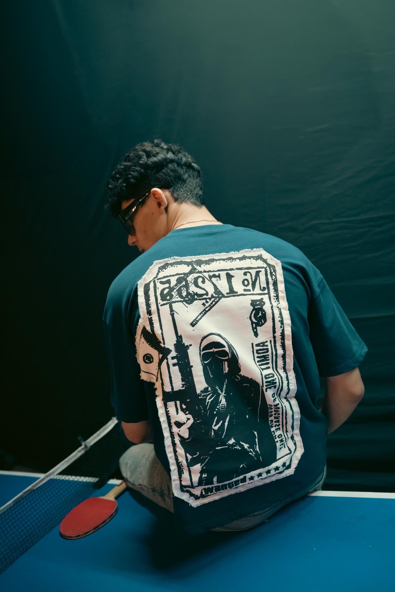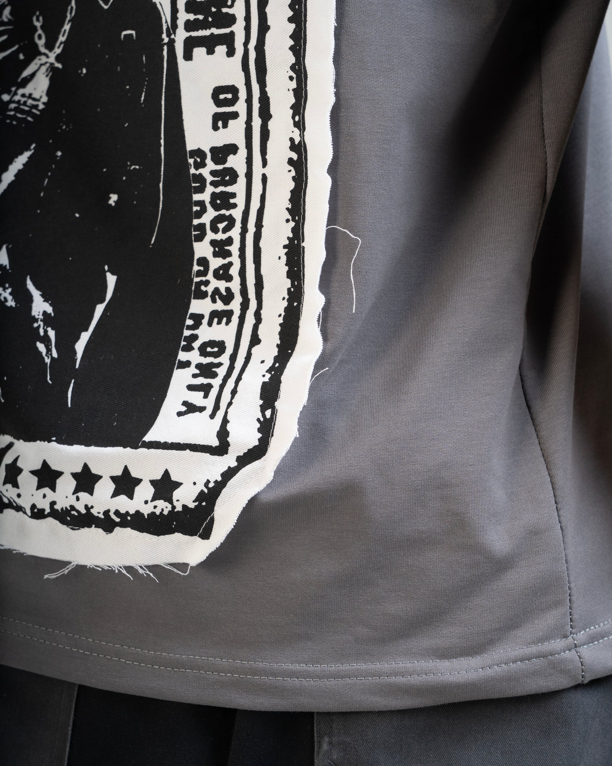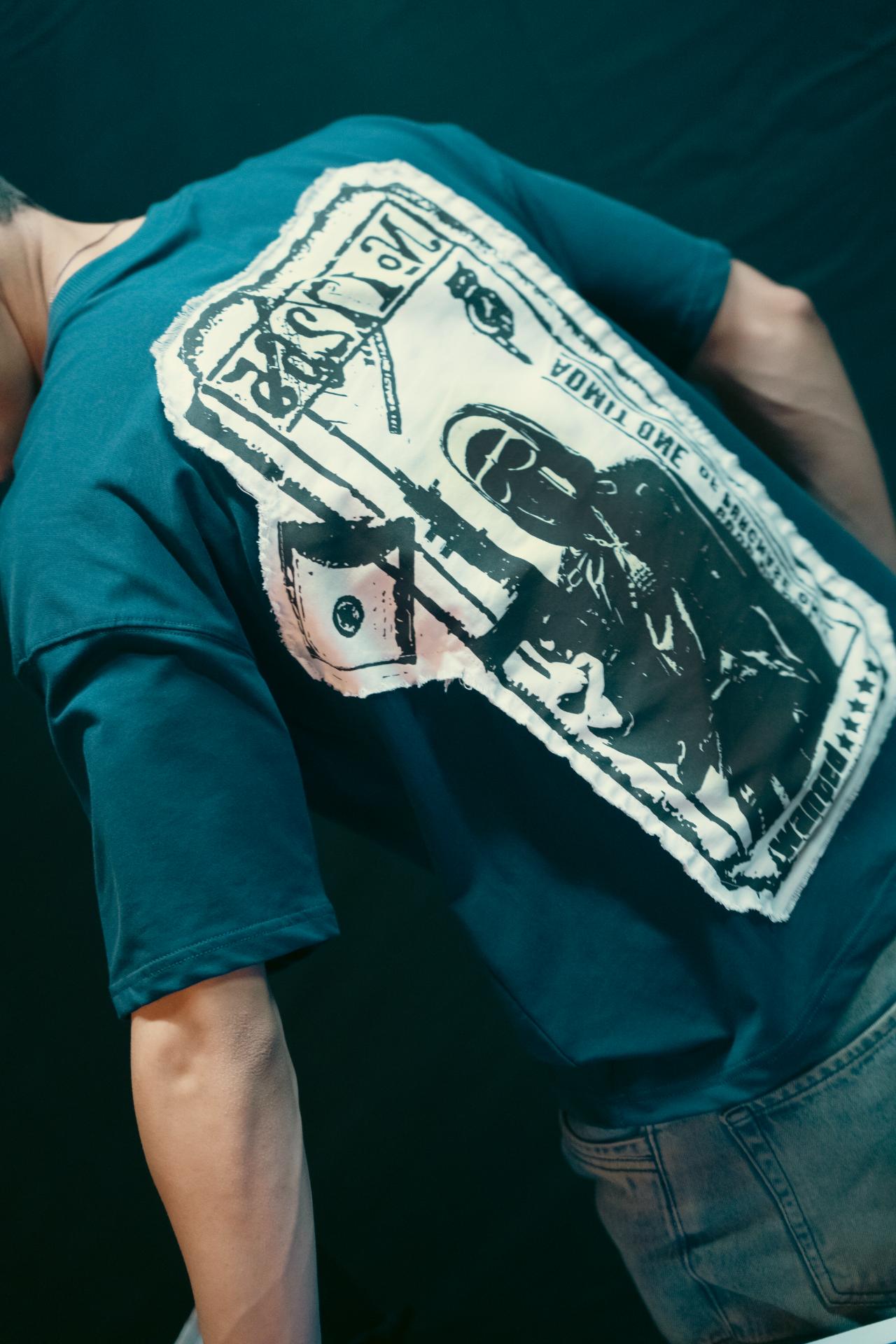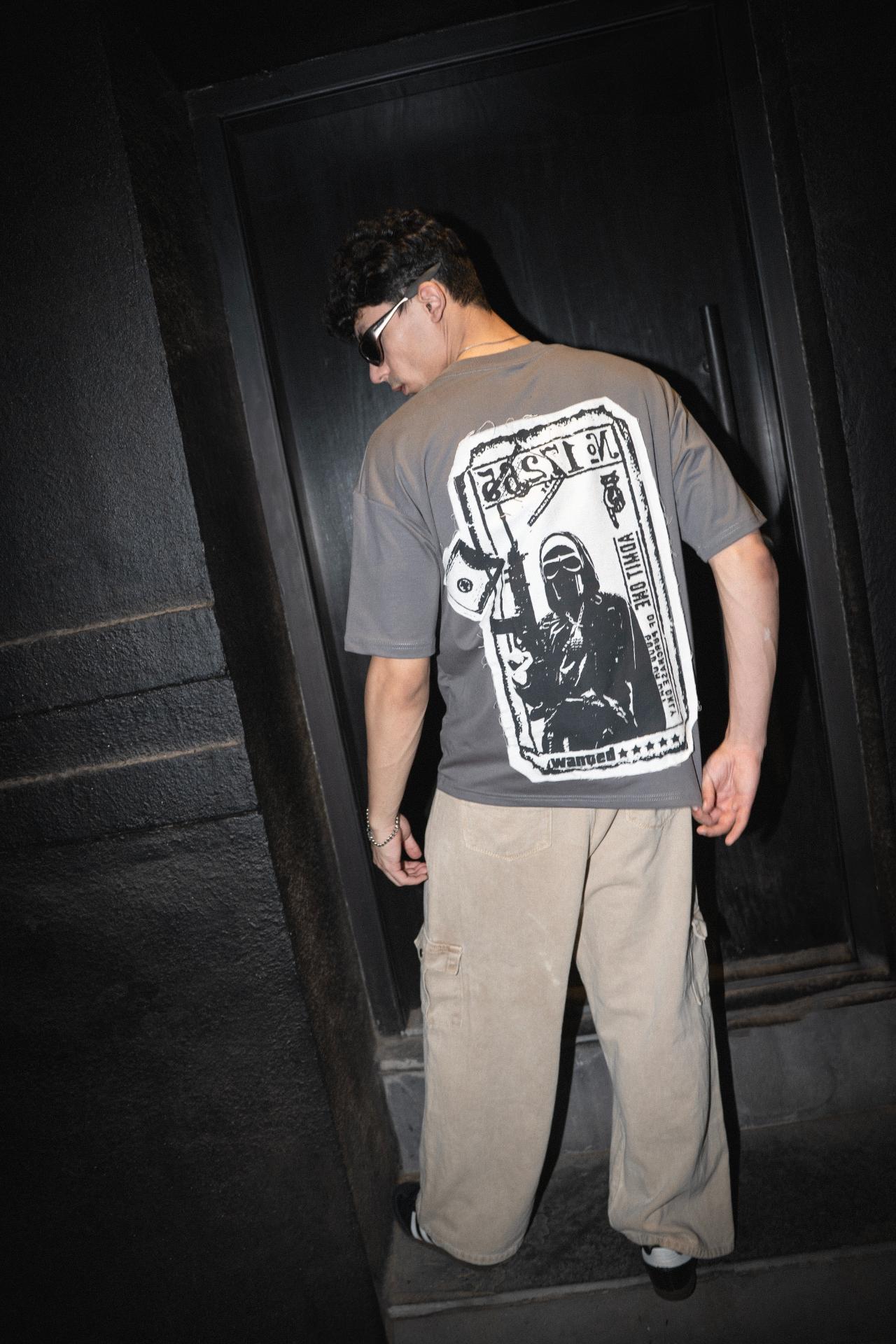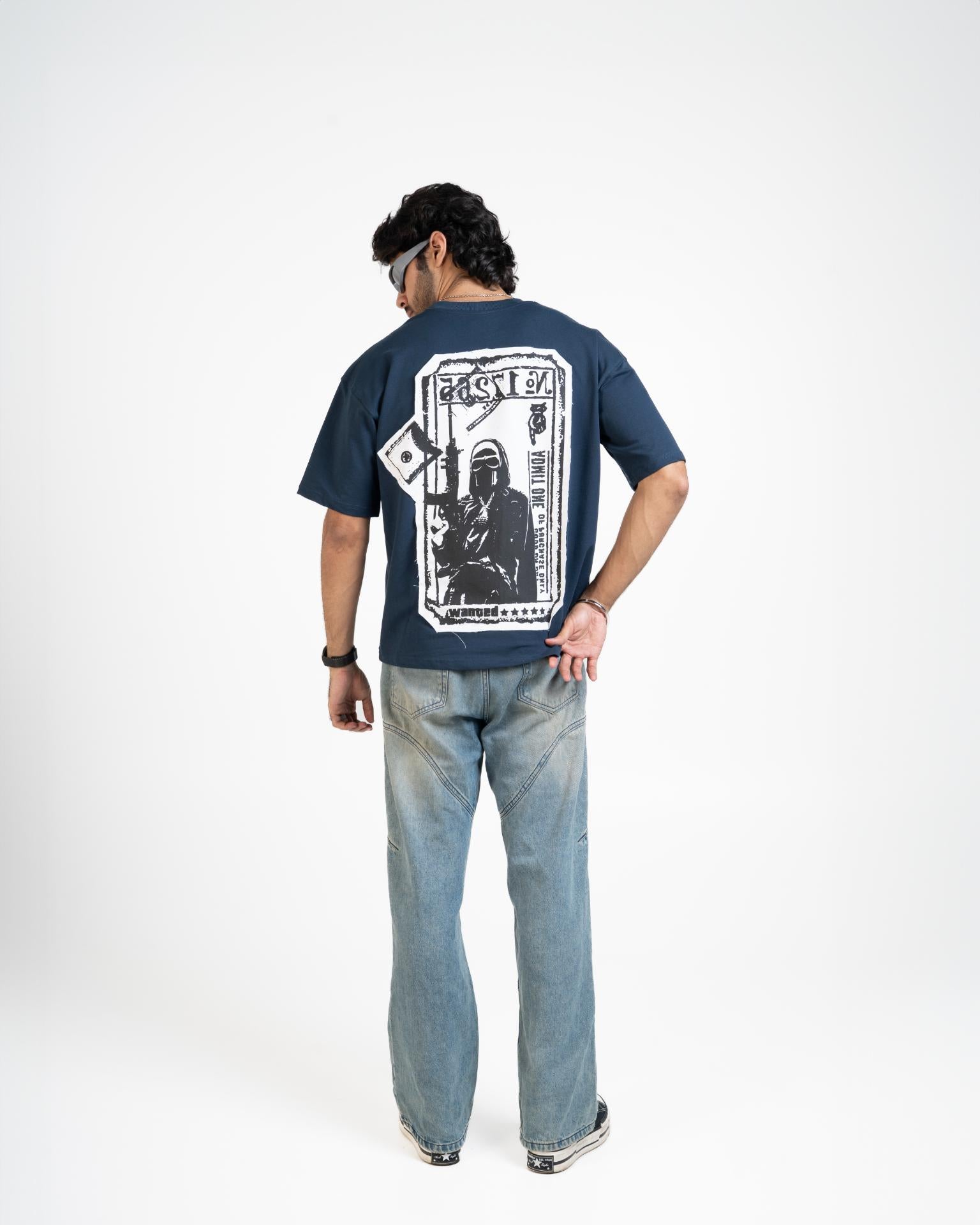 A bold fusion of street style and raw creativity. This blue and grey tee stands out with an oversized patchwork design, featuring loose thread details for a rugged, deconstructed look. The statement graphic brings to life a hand-sketched gangster illustration on a vintage ticket, blending nostalgia with an unapologetic edge. Designed for those who make their own rules, this piece is a nod to urban rebellion and artistic expression.